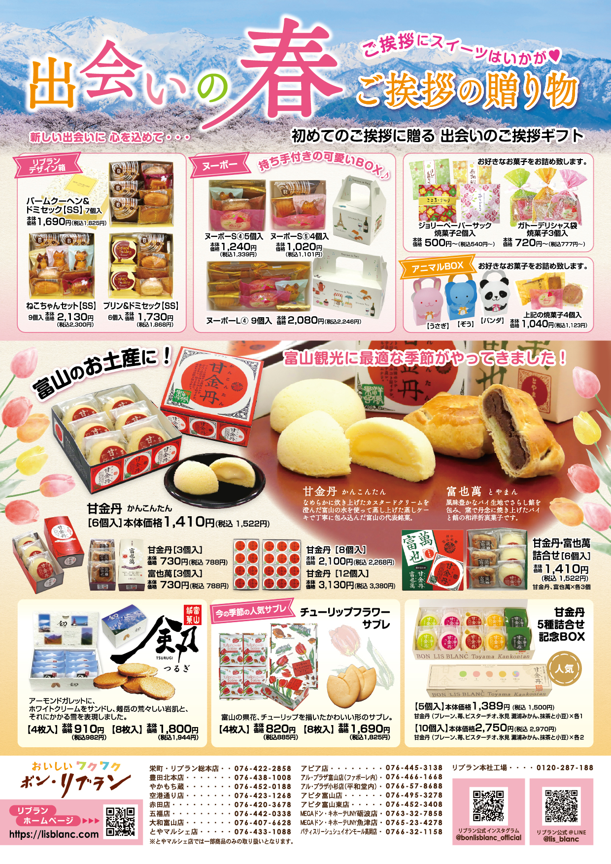 富山の代表銘菓として、富山の皆様に愛され続けるなめらかなカスタードクリーム入り「甘金丹」と、こし餡をパイで包み込んだ「富也萬」。その他にも、富山にまつわる商品「剱」や「越中富山の売薬さん」、「チューリップフラワーサブレ」など、多数取り揃えております。