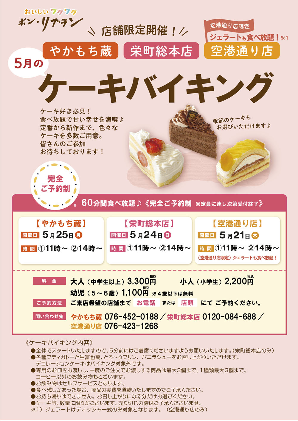 イベント情報 ニュース 新着情報一覧 ケーキバイキング(4・5月)開催について 下記の日程、店舗においてケーキバイキングを開催いたします。事前ご予約制となっております。ご予約は開催店舗までお電話かご来店にてご予約を承ります。 リブラン 栄町総本店【住所】富山県富山市栄町2-1-5TEL:0120-084-688 【営業時間】9:30~19:00やかもち蔵 【住所】富山県富山市上飯野1−1TEL:076-452-0188 【営業時間】9:00~19:00リブラン空港通り店 【住所】富山県富山市黒瀬北町1-3-3TEL:076-423-1268 【営業時間】10:00~19:00 Facebook postはてブLINEPocketFeedly