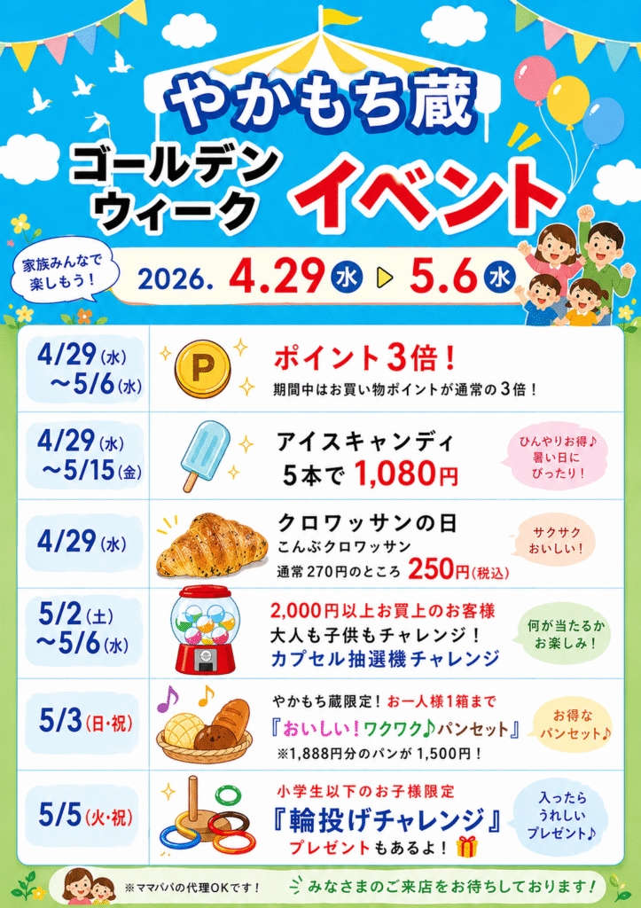 【対象店舗】栄町総本店、北本店、空港通り店、やかもち蔵、赤田店、五福店、アピア店