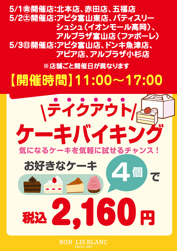 【開催日】5/2(土)【対象店】アピタ富山東店、パティスリーシュシュ(イオンモール高岡)、アルプラザ富山店(ファボーレ)