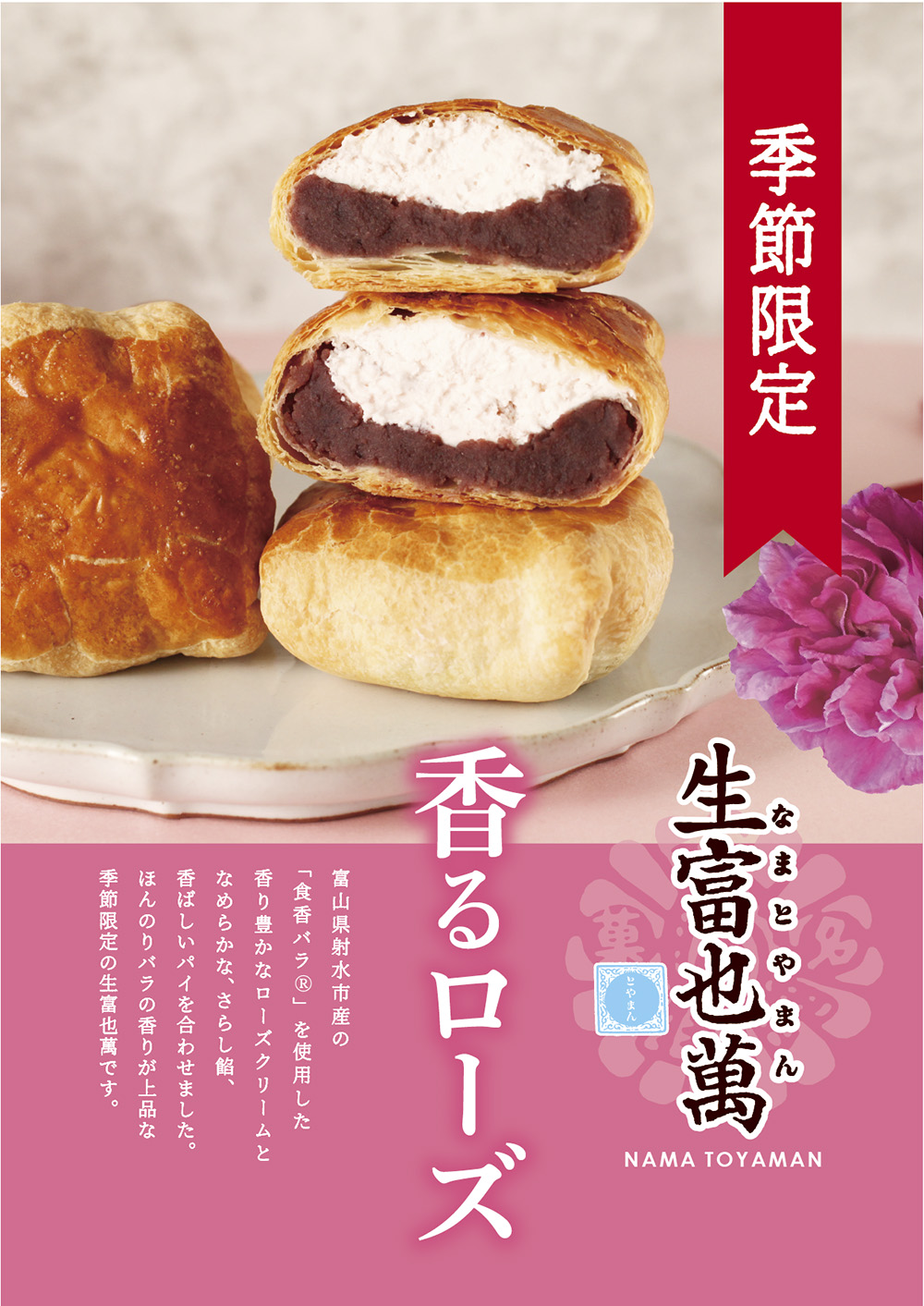 商品 生富也萬 香るローズ(なまとやまん かおるろーず) 5月1日(金)より販売開始! 富山県射水市産の「食香バラ(R)」を使用した香り豊かなローズクリームと、なめらかなさらし餡、香ばしいパイを合わせました。ほんのりバラの香りが上品な季節限定の生富也萬です。 Facebook postはてブLINEPocketFeedly