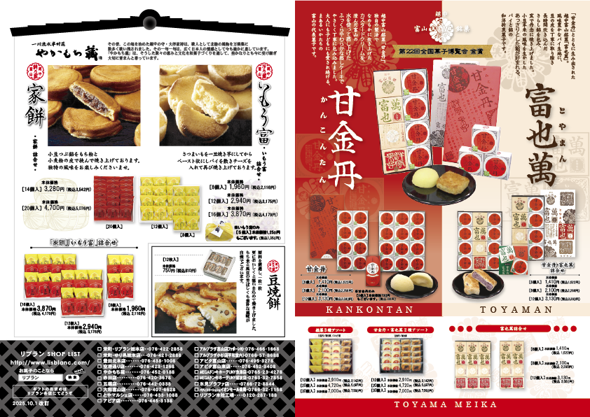 リブランの富山銘菓。富山を代表する銘菓「甘金丹」をはじめ、金賞受賞の「富也萬」など、幅広い年代に愛される、とやま銘菓・お菓子です。お土産物などで人気で、旅行や帰省のお土産として全国のみなさまにも愛されるリブラン自慢の和菓子・銘菓です。とやま銘菓ならリブランにお任せください! クリックすると拡大します クリックすると拡大します いもう富(いもうと)|富山銘菓 富山銘菓 いもう富国産のさつまいもを焼き芋にしてからペースト状にし、パイを敷きチーズを入れて再び焼き上げております。和と ...>>詳細はコチラ 甘金丹(かんこんたん)|富山銘菓 食のプロが選ぶジャパン・フード・セレクション グランプリ受賞(2023年10月)、全国菓子大博覧会「金賞」受賞など、多く ...>>詳細はコチラ 生富也萬 コーヒー牛乳 「生富也萬」に秋限定のお味「生富也萬 コーヒー牛乳味」が8月27日(水)より登場!みんな大好きコーヒー牛乳味が生富也萬に ...>>詳細はコチラ 甘金丹 モンブラン 「甘金丹」に期間限定のお味「甘金丹 モンブラン」が8月27日(水)より新発売!渋皮入りマロンクリームとまろやかなカスター ...>>詳細はコチラ 生富也萬(なまとやまん) 60周年を記念して富山銘菓【富也萬】に新作「生富也萬」が新発売!甘金丹と並ぶ富山銘菓「富也萬」は「富山」の名を全国に知っ ...>>詳細はコチラ 甘金丹5種詰め合わせ|富山銘菓 富山銘菓として有名な「甘金丹」の5種詰め合わせセットが記念BOXで登場! 【プレーン】全国菓子大博覧会「金賞」受賞の”甘 ...>>詳細はコチラ 富也萬(とやまん)|富山銘菓 甘金丹とともに愛され続ける越中富山銘菓「富也萬」。全国菓子大博覧会「金賞」受賞。豆の皮を丁寧に取り、じっくりと長時間炊き ...>>詳細はコチラ カスタードプリン|富山銘菓 富山の自然味溢れる牛乳をたっぷりと使い、素朴ながらも素材のおいしさを最大限に引き出した味わい深い一品です。なめらかな質感 ...>>詳細はコチラ 地卵カステラ|富山銘菓 富山銘菓 地元富山で取れた卵を使用して作った、ふっかふかのカステラです。蜂蜜を加えることでよりしっとりとした食感に仕上げ ...>>詳細はコチラ 家餅(やかもち)|富山銘菓 富山銘菓 最上級の小豆粒餡を、もち粉と小麦粉の皮で挟んで焼き上げました。モチモチっとした弾力のある食感が大人気のお品です ...>>詳細はコチラ チューリップフラワーサブレ|富山銘菓 砺波野に咲くチューリップのお花を描いたかわいい形のクッキーです。ひとくち頬ばると甘みと香ばしさがさっくりと馴染みます。 ...>>詳細はコチラ 売薬さん|富山銘菓 富山銘菓【プレーン】黄味餡と白こし餡のやさしい甘さのミルク饅頭【チョコ】チョコ餡の香ばしいチョコ饅頭 全国の人々の健康を ...>>詳細はコチラ 剱(つるぎ)|富山銘菓 富山銘菓 バリッバリッっと、凍る雪山を踏みしめるような歯ごたえとホワイトクリームの甘さが香ばしいクッキーです。 剱(つる ...>>詳細はコチラ 甘金丹MIX(かんこんたん)|富山銘菓 富山銘菓として有名な「甘金丹」に発売33周年を記念 して「苺味」、「ピスタチオ味」の2種類を新発売。人気のプレーンに新作 ...>>詳細はコチラ