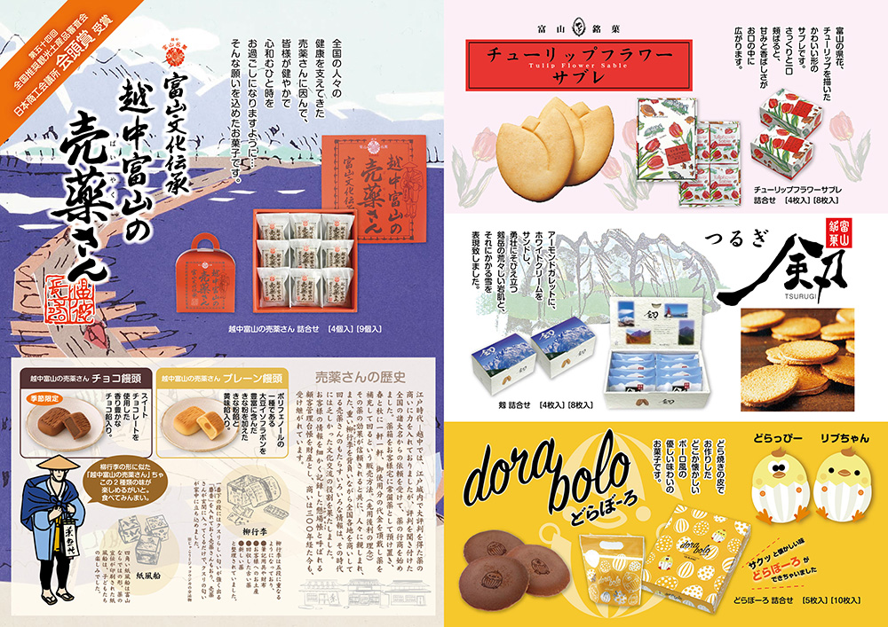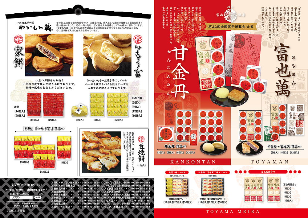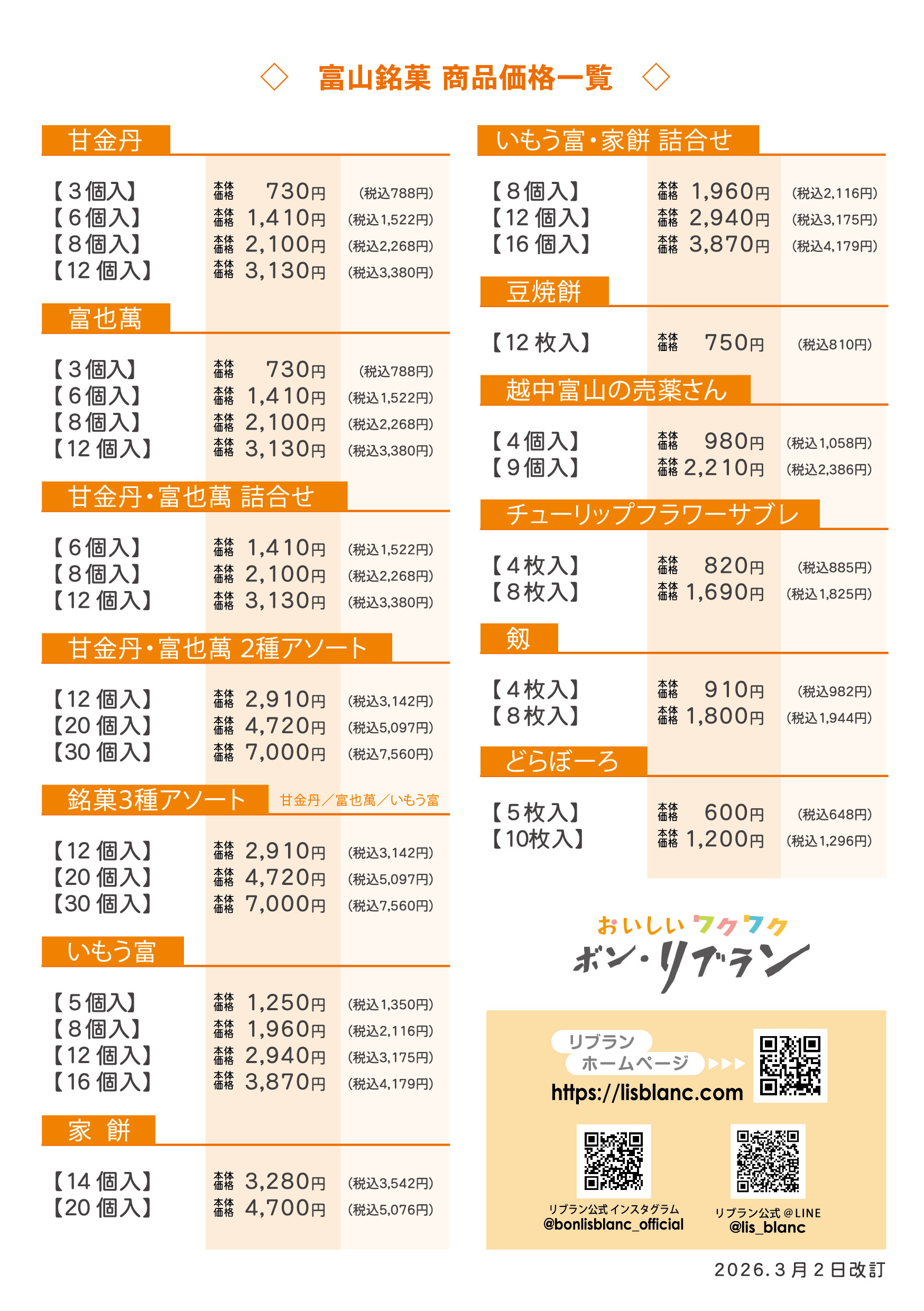 リブランの富山銘菓。富山を代表する銘菓「甘金丹」をはじめ、金賞受賞の「富也萬」など、幅広い年代に愛される、とやま銘菓・お菓子です。お土産物などで人気で、旅行や帰省のお土産として全国のみなさまにも愛されるリブラン自慢の和菓子・銘菓です。とやま銘菓ならリブランにお任せください!※価格はページ下部の価格表を参照ください クリックすると拡大します クリックすると拡大します クリックすると拡大します 生富也萬(なまとやまん) 60周年を記念して富山銘菓【富也萬】に新作「生富也萬」が新発売!甘金丹と並ぶ富山銘菓「富也萬」は「富山」の名を全国に知っ ...>>詳細はコチラ いもう富(いもうと)|富山銘菓 富山銘菓 いもう富国産のさつまいもを焼き芋にしてからペースト状にし、パイを敷きチーズを入れて再び焼き上げております。和と ...>>詳細はコチラ 甘金丹(かんこんたん)|富山銘菓 食のプロが選ぶジャパン・フード・セレクション グランプリ受賞(2023年10月)、全国菓子大博覧会「金賞」受賞など、多く ...>>詳細はコチラ 甘金丹5種詰め合わせ|富山銘菓 富山銘菓として有名な「甘金丹」の5種詰め合わせセットが記念BOXで登場! 【プレーン】全国菓子大博覧会「金賞」受賞の”甘 ...>>詳細はコチラ 富也萬(とやまん)|富山銘菓 甘金丹とともに愛され続ける越中富山銘菓「富也萬」。全国菓子大博覧会「金賞」受賞。豆の皮を丁寧に取り、じっくりと長時間炊き ...>>詳細はコチラ カスタードプリン|富山銘菓 富山の自然味溢れる牛乳をたっぷりと使い、素朴ながらも素材のおいしさを最大限に引き出した味わい深い一品です。なめらかな質感 ...>>詳細はコチラ 地卵カステラ|富山銘菓 富山銘菓 地元富山で取れた卵を使用して作った、ふっかふかのカステラです。蜂蜜を加えることでよりしっとりとした食感に仕上げ ...>>詳細はコチラ 家餅(やかもち)|富山銘菓 富山銘菓 最上級の小豆粒餡を、もち粉と小麦粉の皮で挟んで焼き上げました。モチモチっとした弾力のある食感が大人気のお品です ...>>詳細はコチラ チューリップフラワーサブレ|富山銘菓 砺波野に咲くチューリップのお花を描いたかわいい形のクッキーです。ひとくち頬ばると甘みと香ばしさがさっくりと馴染みます。 ...>>詳細はコチラ 売薬さん|富山銘菓 富山銘菓【プレーン】黄味餡と白こし餡のやさしい甘さのミルク饅頭【チョコ】チョコ餡の香ばしいチョコ饅頭 全国の人々の健康を ...>>詳細はコチラ 剱(つるぎ)|富山銘菓 富山銘菓 バリッバリッっと、凍る雪山を踏みしめるような歯ごたえとホワイトクリームの甘さが香ばしいクッキーです。 剱(つる ...>>詳細はコチラ 甘金丹MIX(かんこんたん)|富山銘菓 富山銘菓として有名な「甘金丹」に発売33周年を記念 して「苺味」、「ピスタチオ味」の2種類を新発売。人気のプレーンに新作 ...>>詳細はコチラ
